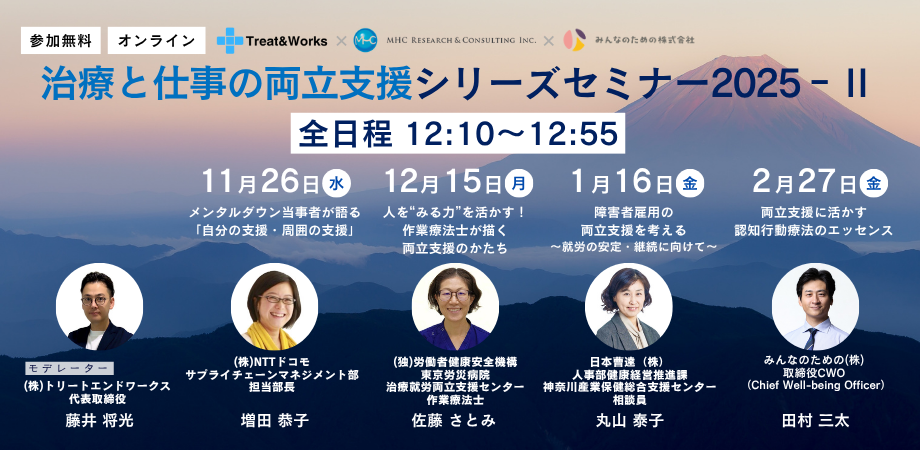 株式会社トリートエンドワークス(所在地:東京都渋谷区、 代表取締役:藤井将光)は、一般社団法人MHCリサーチ&コンサルティング(所在地:東京都港区、代表理事:田村三太)とみんなのための株式会社(所在地:東京都練馬区、代表取締役:田村里佳)共催で「治療と仕事の両立支援シリーズセミナー」を2025年11月26日、12月15日、2026年1月16日、2月27日(全日程:12時10分~12時55分)にオンライン開催いたします。本セミナーは、「治療と仕事の両立支援の課題と対策」をテーマに、主に人事担当者・管理監督者・産業保健スタッフなど企業にお勤めの方を対象に企画しています。その他、ご興味のある方もお気軽にご参加ください。